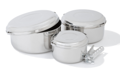 Das Topfset von Alpine ist aus unglaublich haltbarem Edelstahl gefertigt, der selbst den extremsten Bedingungen zuverlässig standhält. Es eignet sich perfekt für den harten Einsatz bei Vielreisenden oder bei Führern und Institutionen, die bei einer Vielzahl von Abenteuern viele Mahlzeiten zubereiten müssen.