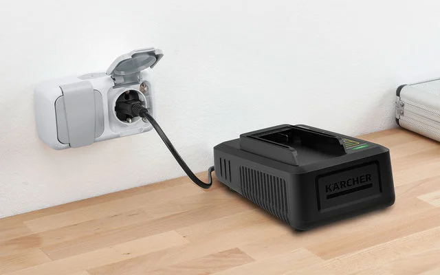Das Schnellladegerät kann dank der integrierten Wandhalterung ganz einfach an der Wand befestigt werden. Mit dem Schnellladegerät ist der Kärcher Battery Power Wechselakku in nur 44 Minuten zu 80 % aufgeladen. Auch alle weiteren 18 V Battery Power Wechselakkus der Kärcher 18 V Battery Power Akkuplattform können damit aufgeladen werden.