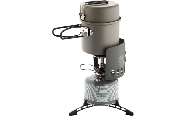 Ist sparsam im Verbrauch und ein wahres Leistungswunder mit 28 % schnellerer Kochzeit bei 20 % Brennstoffeinsparung. (Anmerkung: schneller als mit einem normalen Topf ohne Deckel oder Windschutz).