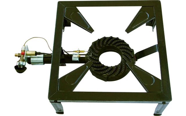 Hockerkocher mit einem windstabilen Brenner aus massivem Gusseisen und Gestell aus Stahlblech.