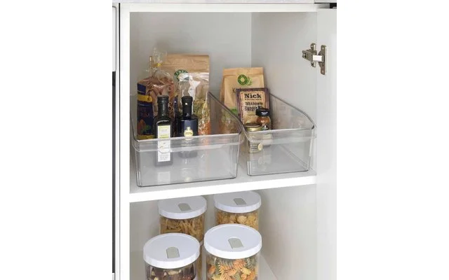 Die transparente Aufbewahrungsbox aus robustem PET schafft übersichtliche Ordnung. Dosen, Becher, Gewürze, Öl und Essig, Tütchen & Co. können voneinander getrennt und geordnet im Vorratsschrank platziert werden.
