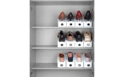 Mehr Platz und Ordnung im Schuhschrank gesucht? Der clevere Schuhhalter bietet 50 % mehr Platz im Schuhschrank. Die Schuhe werden ganz einfach paarweise übereinander gestapelt und vor Druckstellen und Kratzern geschützt. Der Schuhhalter besteht aus stabilem Kunststoff in klassischem Weiß und ist mit einem praktischen, grauen Griffloch für leichtes Entnehmen ausgestattet. Die Lieferung enthält 4 Schuhalter.